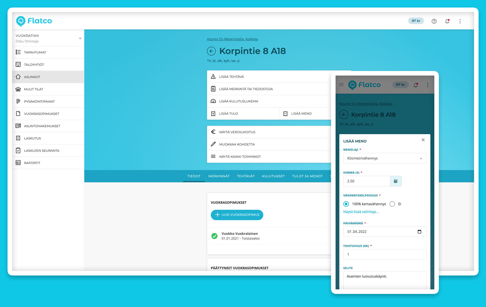 Flatco on vuokrahuoneistojen ja vuokrasuhteiden elinkaaren hallintaan ja dokumentointiin tarkoitettu kevyt ja ketterä palvelu.