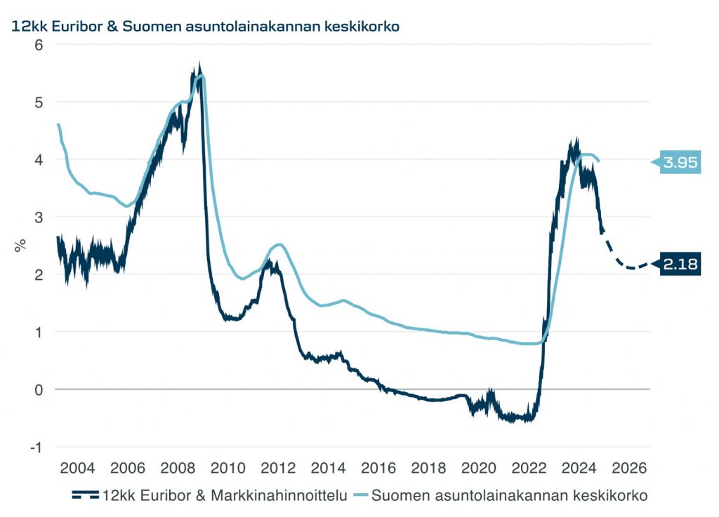 Taloudesta: Markkinan rahoitusolosuhteet ovat jo tässä vaiheessa keventyneet selvästi, ja EKP:n liikepankeille tekemän kyselytutkimuksen perusteella niin asunto- kuin yritysluottojenkin kysynnässä ollaan jo nähty elpymistä. Luotonannon käänne ennakoi myös talouskasvun elpyvän ensi vuotta kohden, Danske Bankin ekonomistit ennustavat koko euroalueelle 1,2 prosentin ja Suomelle 1,8 prosentin talouskasvua 2025. Vahvemman kasvun taustalla on siis rahoitusolojen keventyminen mutta myös kuluttajien ostovoiman vahvistuminen palkkojen nousun ja inflaation hidastumisen myötä.