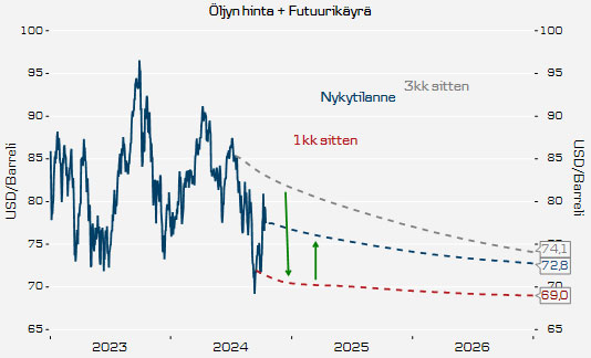 Riskit piilevät geopolitiikassa, mutta myös Yhdysvaltojen vaalit voivat jarruttaa koronlaskuja: Vaikka öljymarkkina on pysynyt rauhallisena, markkinoilla ollaan huolissaan Israelin vastatoimista, jotka saattavat kohdistua Iranin öljytuotantoon ja laajentaa alueellisen konfliktin täysmittaiseksi sodaksi Irania vastaan. Sodan eskaloituessa Iran voisi painostaa länsimaita rauhaan sulkemalla Hormuzinsalmen, jonka kautta kulkee 20 % maailman öljytuotannosta ja 30 % öljykaupasta. Öljyn hintojen nousu jopa yli 100 dollariin barrelilta voisi kiihdyttää inflaatiota ja jarruttaa keskuspankkien odotettuja koronlaskuja. Myös Yhdysvaltojen vaalit voivat tuoda tullikorotuksia ja kiihdyttää hintojen nousua. Näin ollen, se mitä markkina nyt odottaa korkojen olevan tulevaisuudessa on vain paras arvaus – koronlaskuja seuraa, mutta tahti voi muuttua suuntaan tai toiseen.