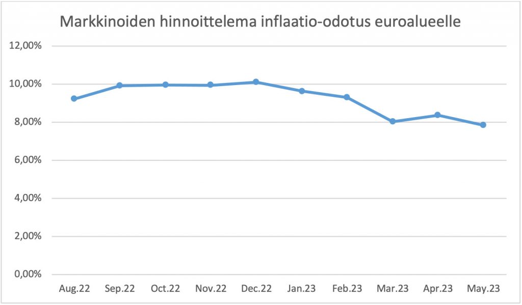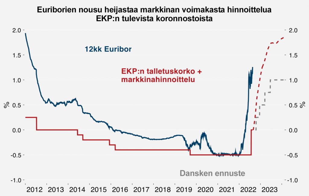 Syyskuun EKP:n kokouksessa markkina uskoo keskuspankin nostavan korkoa jälleen 0,5 %-yksikköä ja edelleen seuraavissa kokouksissa vuoden loppuun mennessä ainakin 0,5 % lisää eli yhteensä 1 % vuoden loppuun saakka. Myös ensi vuodelle hinnoitellaan 0,5 % lisänostoja. Rahapolitiikan kiristyksen taustalla on edelleen inflaatio, joka kiihtyi heinäkuussa 8,9 prosenttiin ja jonka on määrä edelleen kohota noin 10 % tasolle syksyn kuluessa. Markkinat hinnoittelevat 12kk euriborin kohoavan 1.7 %:iin tämän vuoden loppuun mennessä ja jatkavan aina 2 % tasoon.