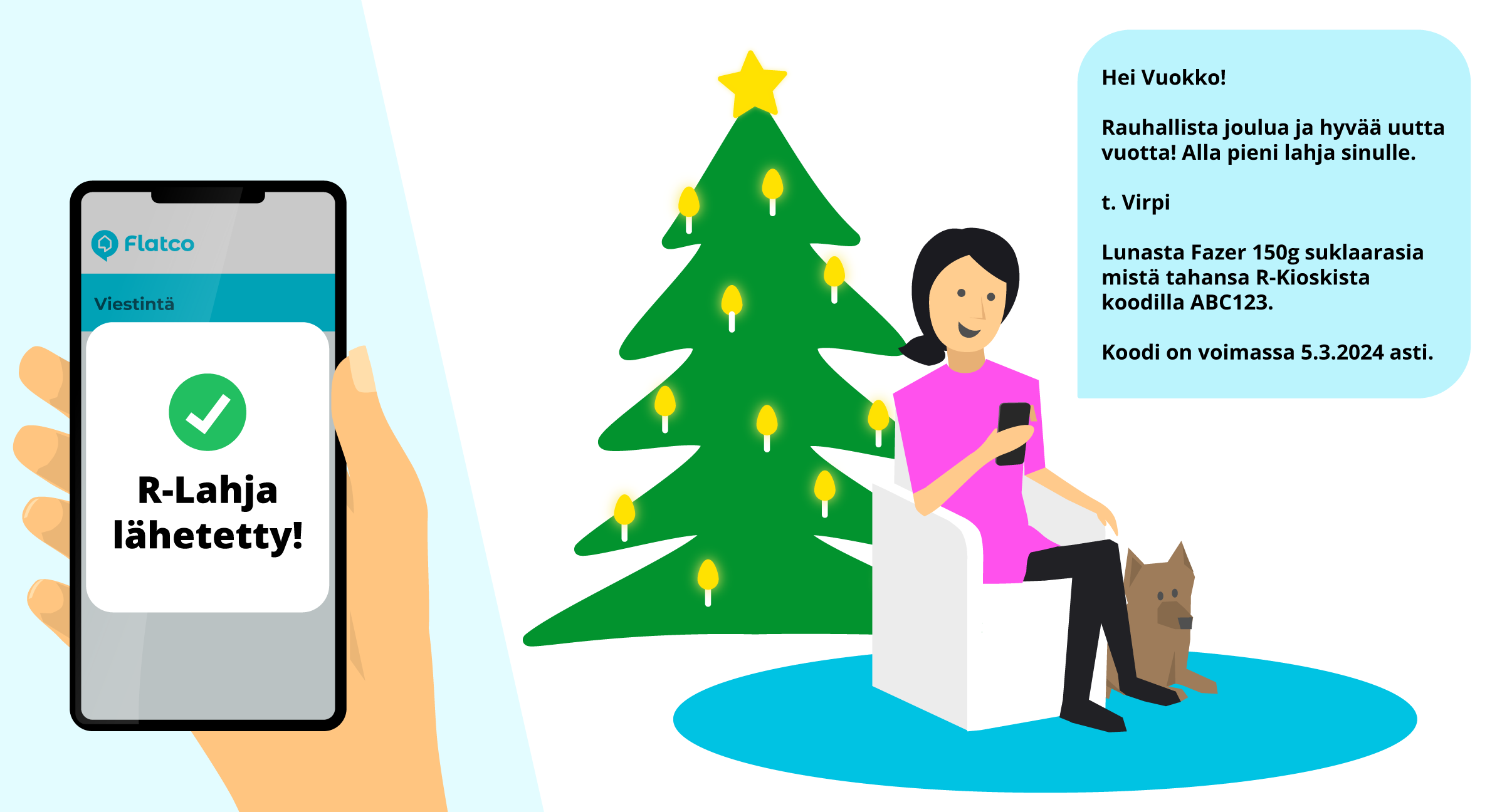 Joulu on hyvä aika muistaa vuokralaista. Flatcon viestintä-sivulta voit nyt lähettää vuokralaisellesi R-lahjan. R-Lahja on R-Kioskin sähköinen lahjakortti, joka toimitetaan vastaanottajalle tekstiviestinä, joka sisältää oman joulutervehdyksesi lisäksi lahjakoodin, jolla vastaanottaja voi lunastaa Fazerin 150g suklaarasian näyttämällä koodin ostoksen yhteydessä millä tahansa suomen R-Kioskeista.