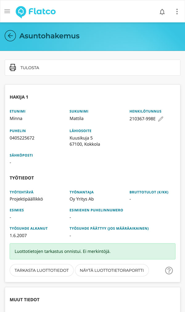 2. Vuokranantaja vastaanottaa hakemuksen ja voi tarkastaa hakijoiden luottotiedot napin painalluksella