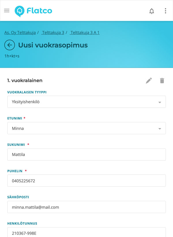 4. Vuokrasopimuksen laadinta vuokralaisen ja vuokrakohteen yksilöllisillä tiedoilla