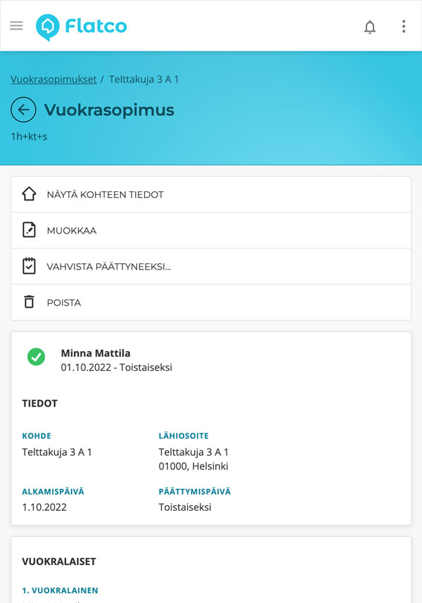 Flatcossa sähköinen vuokrasopimus syntyy muutaman ”klikin” prosessina. Asiakkaidemme mukaan vuokrasopimus saadaan valmiiksi jopa alle 10 minuutissa sopivan vuokrahakemuksen saavuttua. Flatco toimii mobiililaitteen selaimessa mobiilisovellusten tapaan, mahdollistaen vuokrasopimuksen luonnin välittömästi, vaikkapa asuntonäytön yhteydessä. Nopeassa sopimusprosessissa vuokralainen saa haluamansa asunnon ja vuokranantaja hyvän vuokralaisen – kummatkin odottamatta tai ”jännittämättä” sopimuksen syntymistä. Lisäksi tästä syntyy luotettava ja positiivinen asiakaskokemus, ja vuokrasuhde alkaa parhaalla mahdollisella tavalla.
