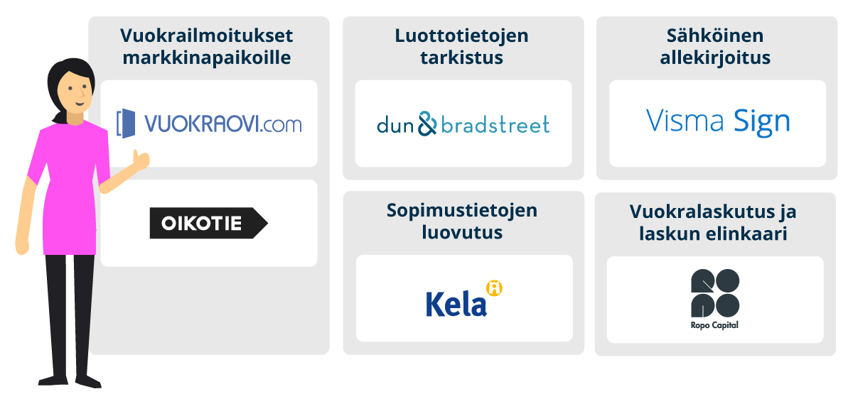 - Käyttää vuokralaskutusta ja vuokralaskujen maksuvalvontaa