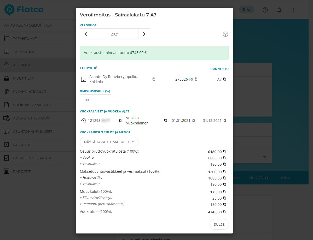 Veroilmoitukset ovat nyt asuntosijoittajan työpöydällä. Jatkossa saat sijoitusasuntojesi veroilmoitustiedot suoraan Flatcosta. Olemme kehittäneet edistyksellisen tulojen ja menojen seurannan, sekä näistä saatavan, yksinkertaisen omavero.fi-lomaketta vastaavan veroilmoitusraportin, josta voit siirtää tiedot veroilmoitukseen vaivattomasti. Jatkossa tulemme mahdollistamaan veroilmoitustietojen lähetyksen Flatcosta suoraan verottajalle (tällä hetkellä odotamme verottajalta tähän soveltuvan palvelurajapinnan virallista julkaisua).