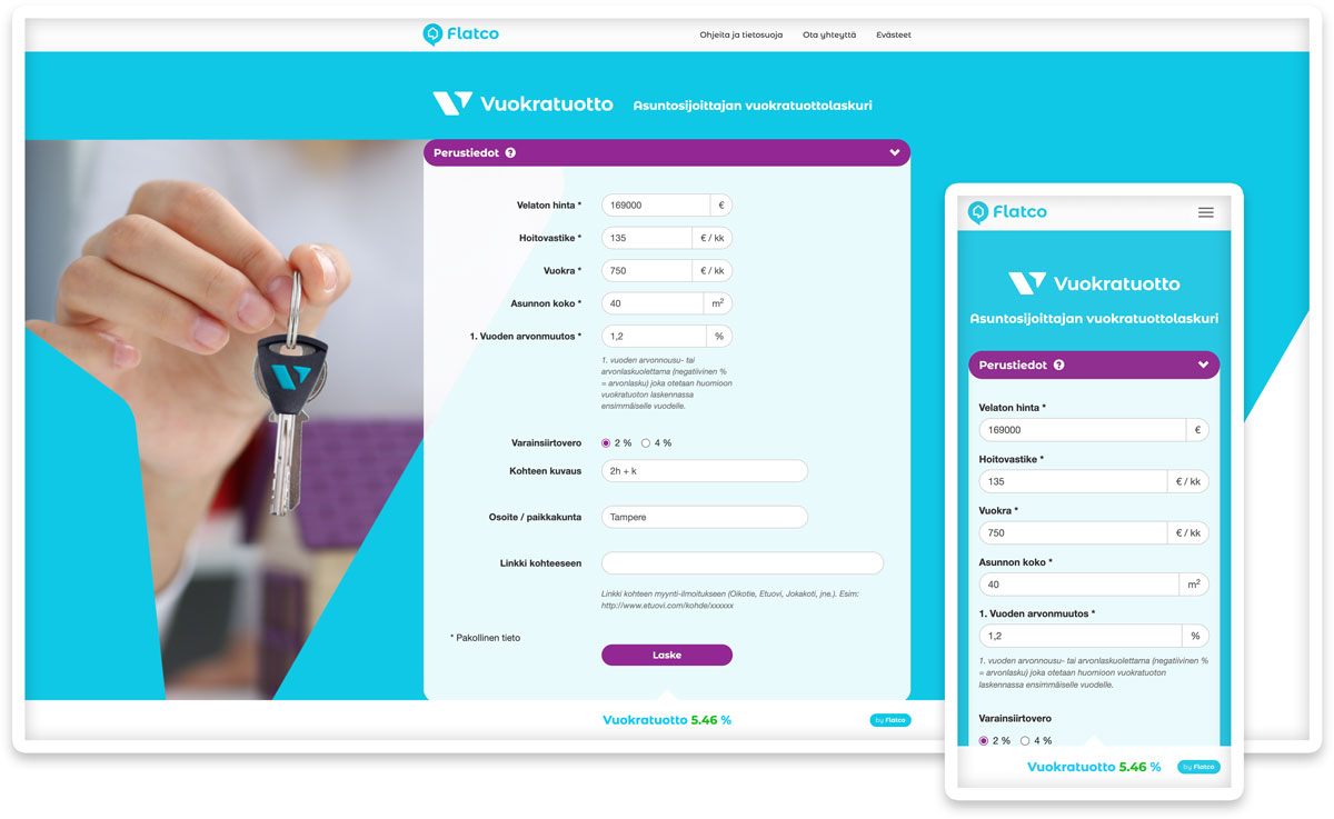 Jo pitkään asuntosijoittajien suosiossa ollut vuokratuotto.fi – vuokratuottolaskurimme sai uuden ilmeen. Vuokratuottolaskuri on alusta asti ollut Flatcon parissa toimivan tiimin tuotos. Flatco ja vuokratuotto liittyvät molemmat vahvasti asuntosijoittamiseen, joten palveluiden ilmeen yhtenäistäminen oli luontevaa. Ainoastaan ulkoasu on muuttunut. Palvelu on tismalleen sama, kuin tähänkin saakka.