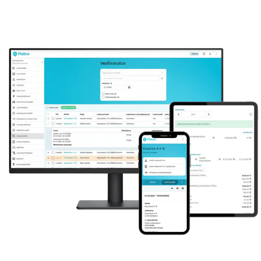 Flatco kokoaa vuokrauksen ja kulutuksen laskutuksen, reskontran seurannan ja taloushallinnon integraatiot yhteen kokonaisuuteen.